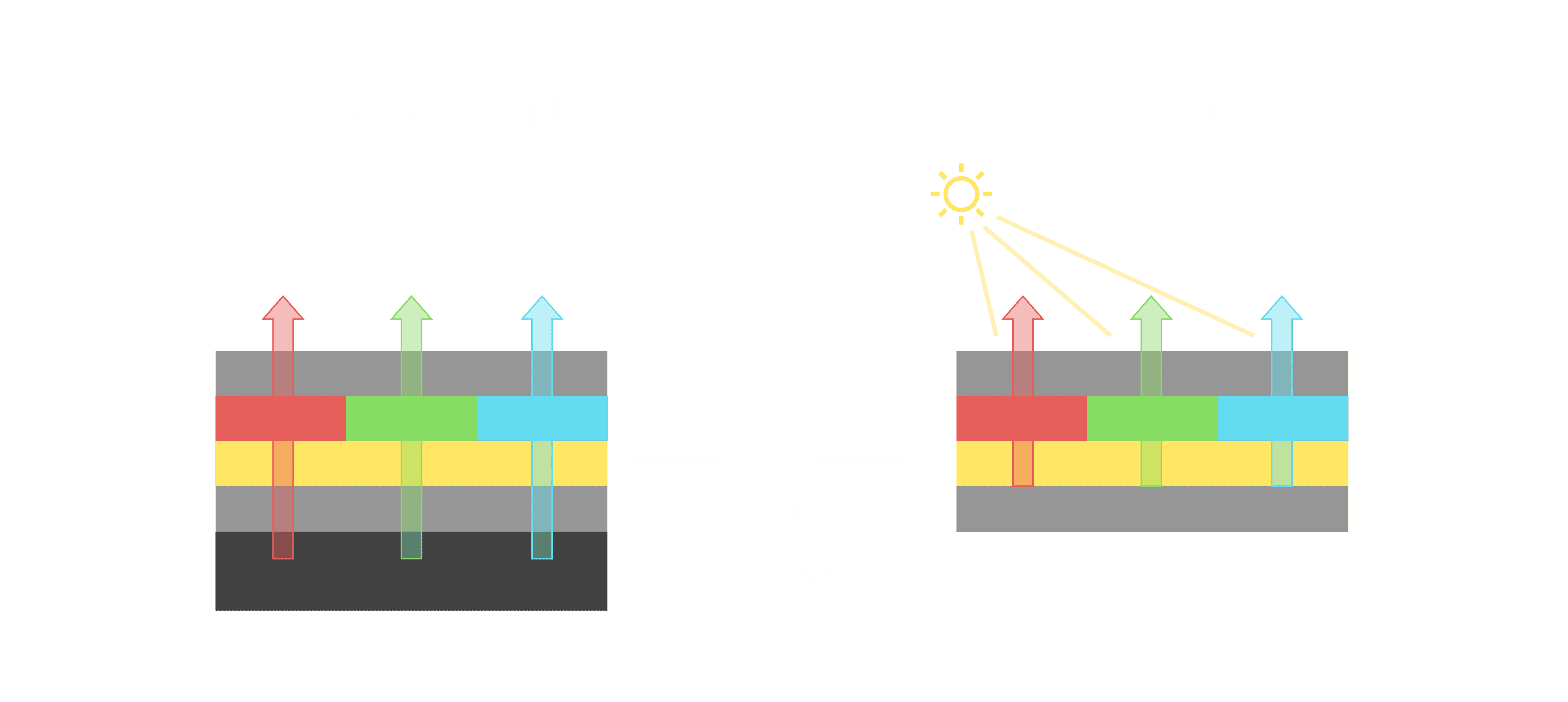 与传统需搭配背光单元的液晶显示相比,,,反射式液晶技术不仅更省电、、、更轻薄,,,且即便在艳阳下仍能清晰显示。。。。此外,,少了背光单元,,,也大幅降低了 LED 蓝光伤害眼睛的疑虑。。。