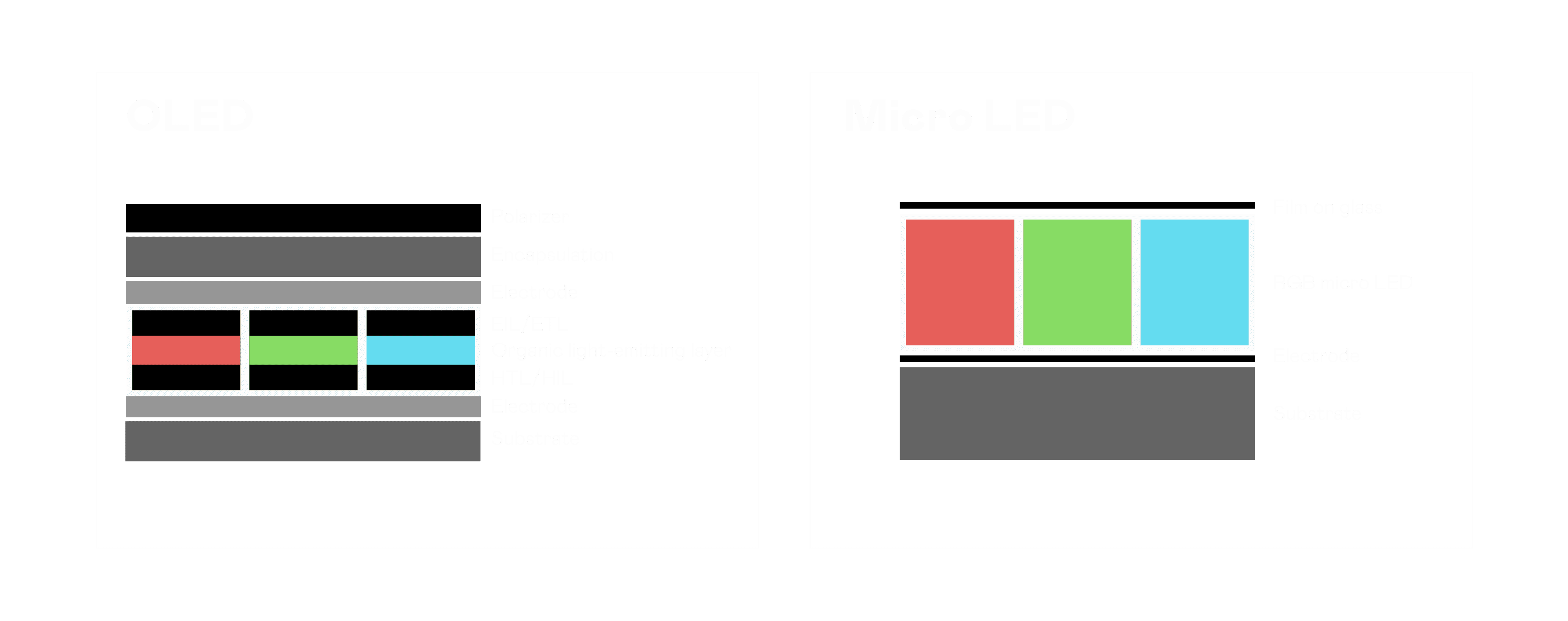以 LED 做为显示画素,,,可让 LED 的发光效率发挥到极致,,从而让显示器具备优异的亮度表现,,,不论是在户外或室内,,,,均具备出众的显示效果。。同时,,与使用有机材料的 OLED 相比,,,,LED 具备更稳定、、、寿命更长的特性,,,不仅不会有画面烙印问题,,,而且更不容易出现故障、、坏点。。。